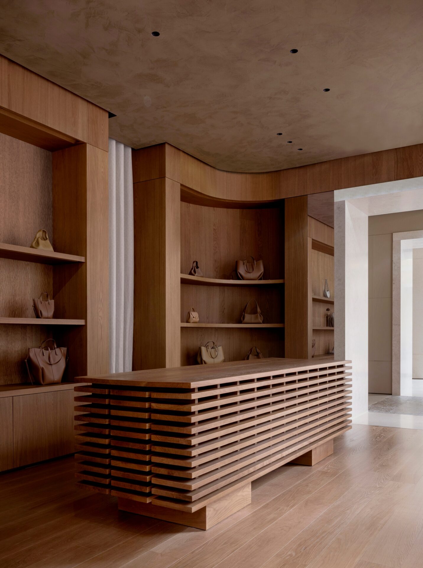 Each room is defined by a single material, explored in its various states from raw to refined. The journey begins in a stone room, where rough-hewn travertine pedestals sit against bocciardato (bush-hammered) limestone walls. From there, visitors pass through a leather room with stacked suede, hanging off-cuts and compressed leather flooring before arriving in the main retail space. This larger room is defined by honey-toned timber, with tree-log pedestals, display tables that evoke stacked lumber, and hand-chiselled shelving.