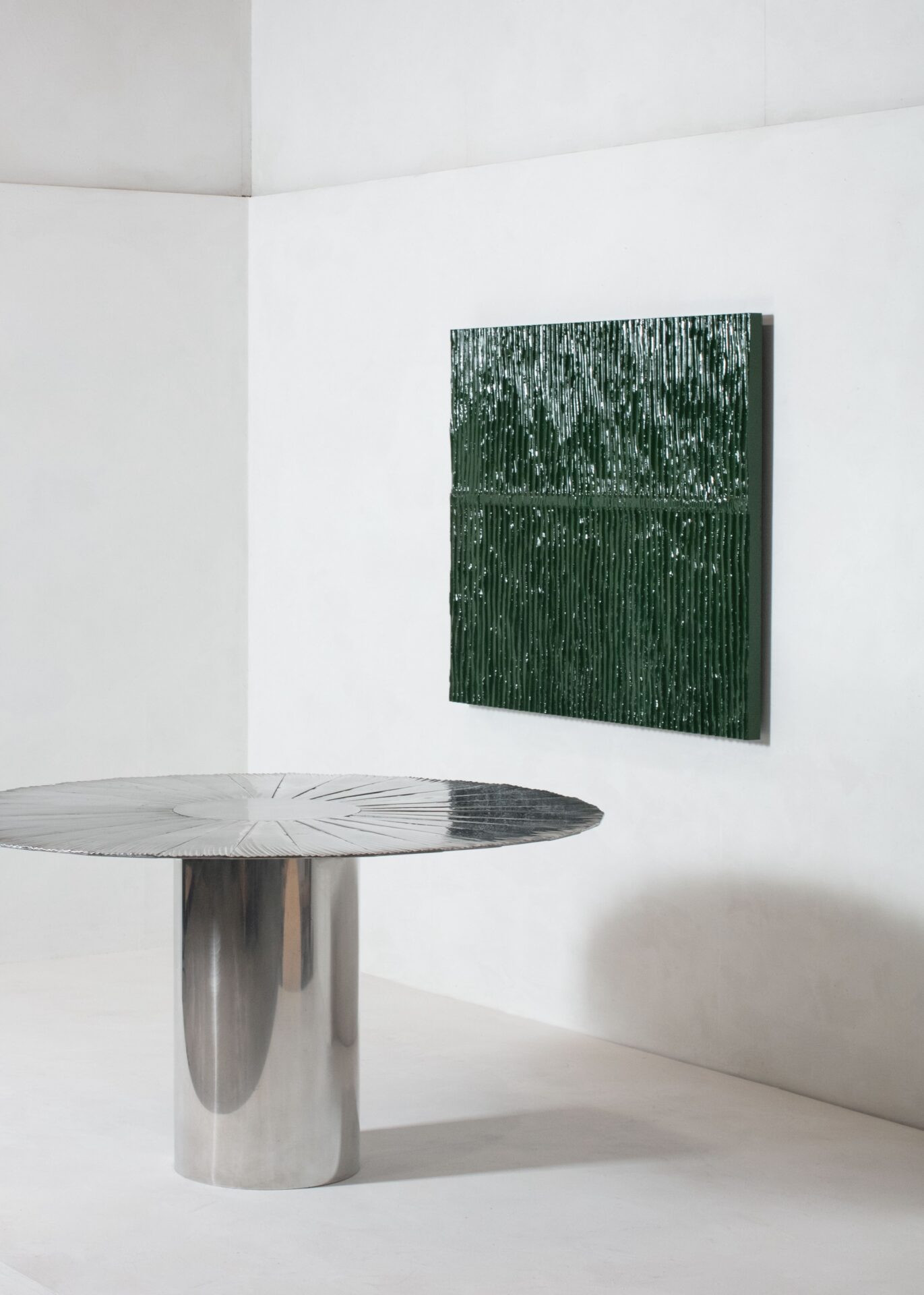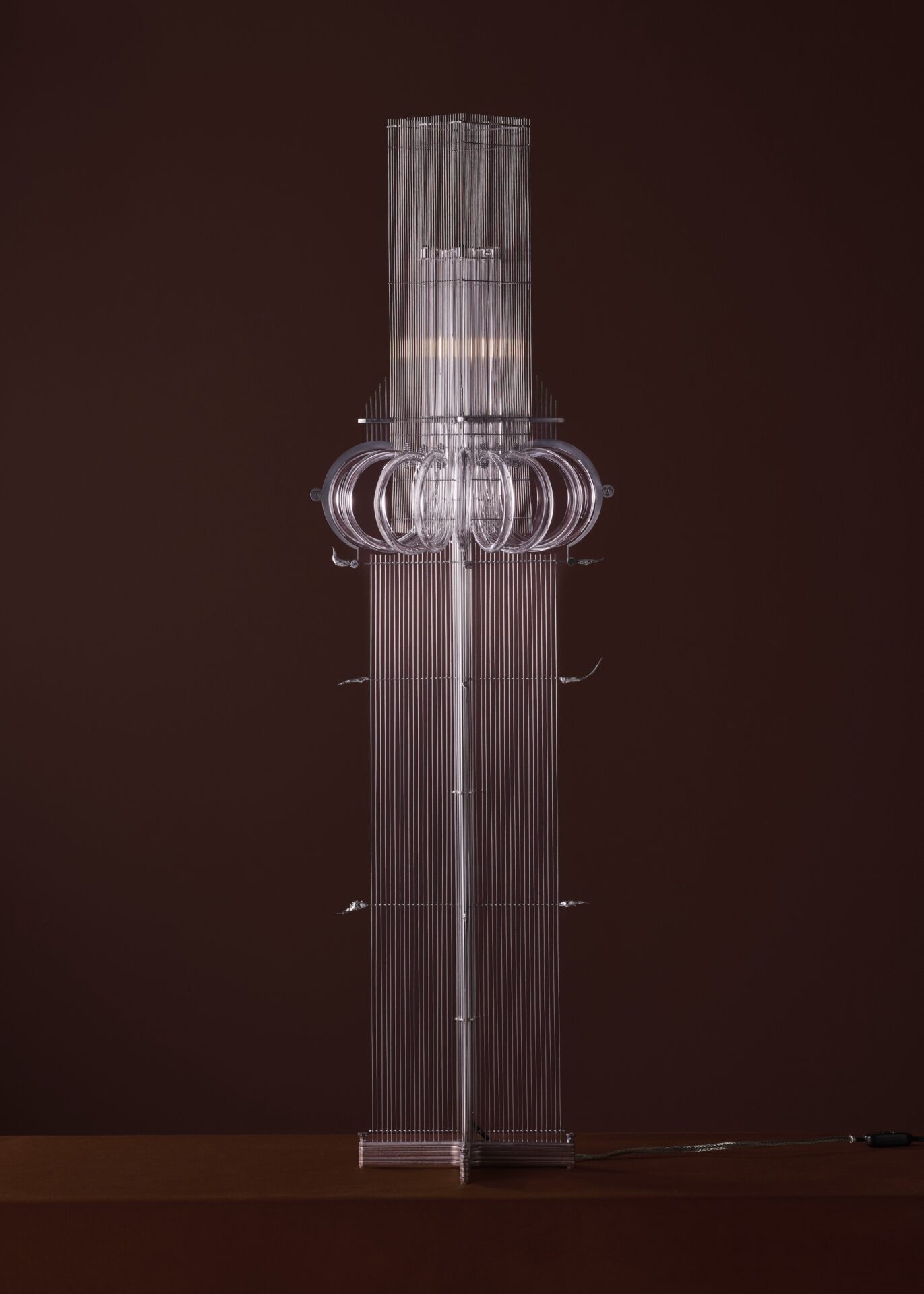 This installation in a private home marks the first large-scale collaboration between Belgian designer Elias Van Orshaegen and interior architect Maarten Van Meerbeeck. Garçonnière translates as ‘bachelor’s apartment’, suggesting a masculine intimacy, and Van Orshaegen and Van Meerbeeck are staging the space as a cinematic environment in several acts. Shown against a backdrop of soft architectural elements made from stretched fabric, the pieces on show include a pine and silk daybed; a table and floor lamp in mahogany, cast aluminium and rock crystal; and a wool rug by Van Meerbeeck.