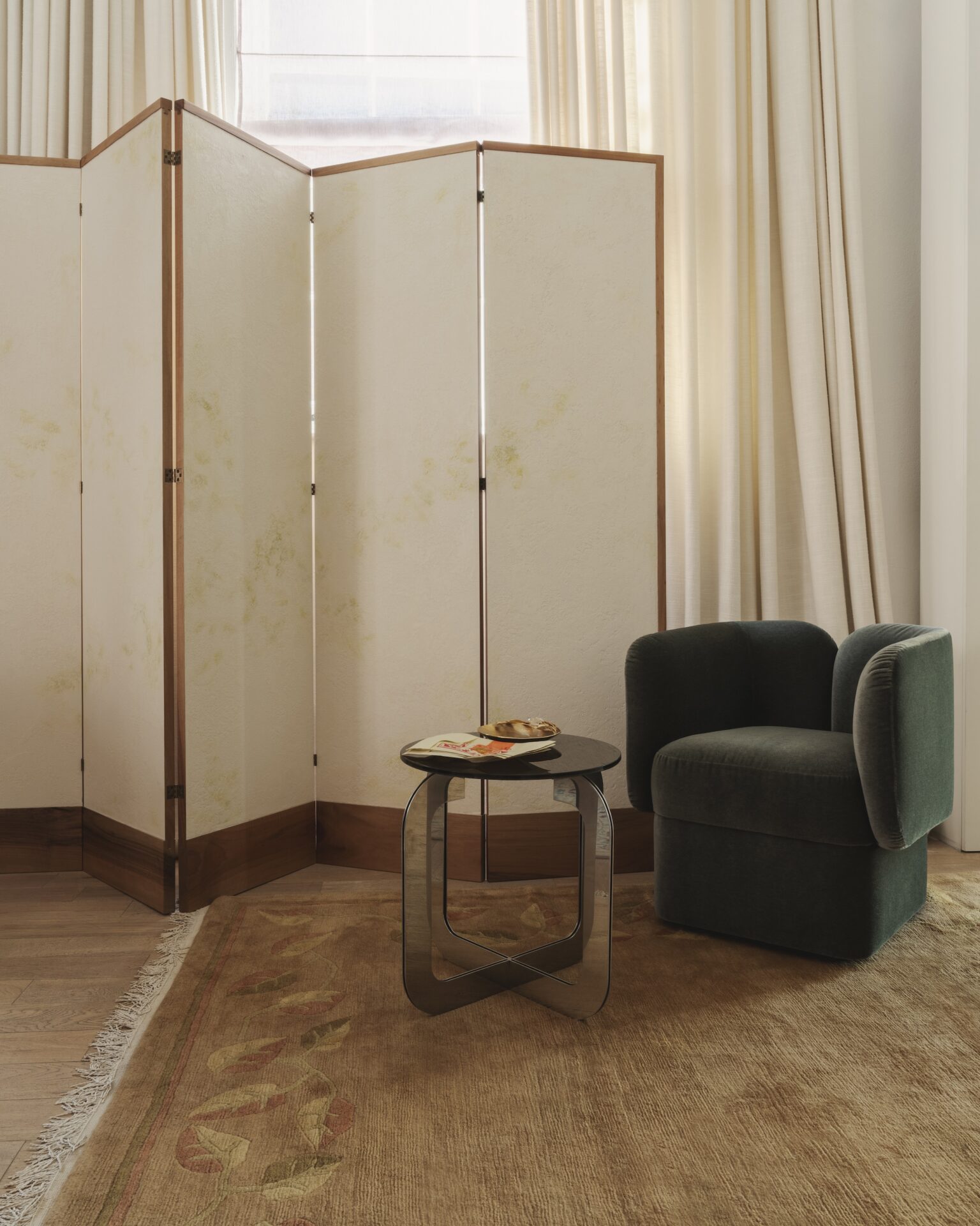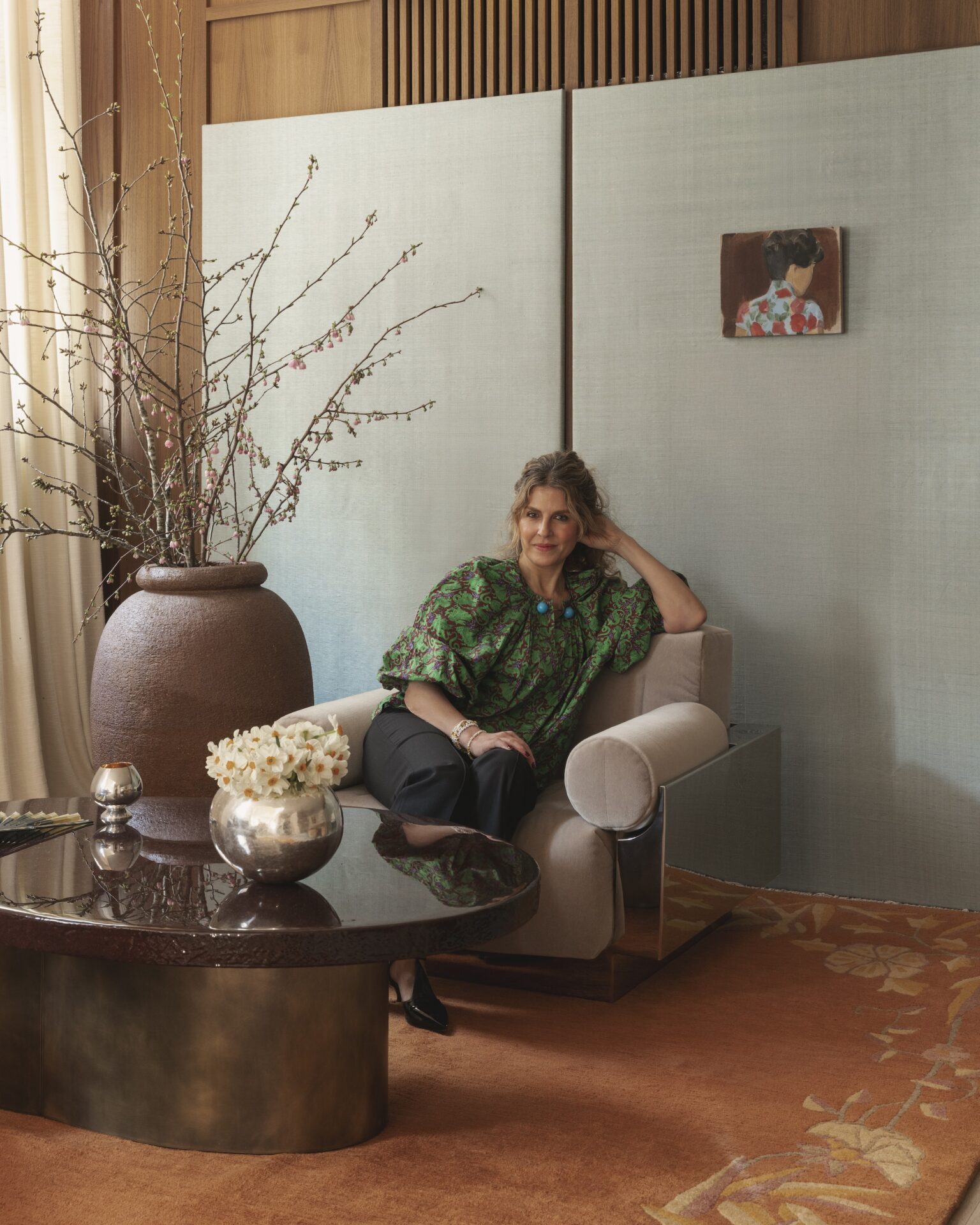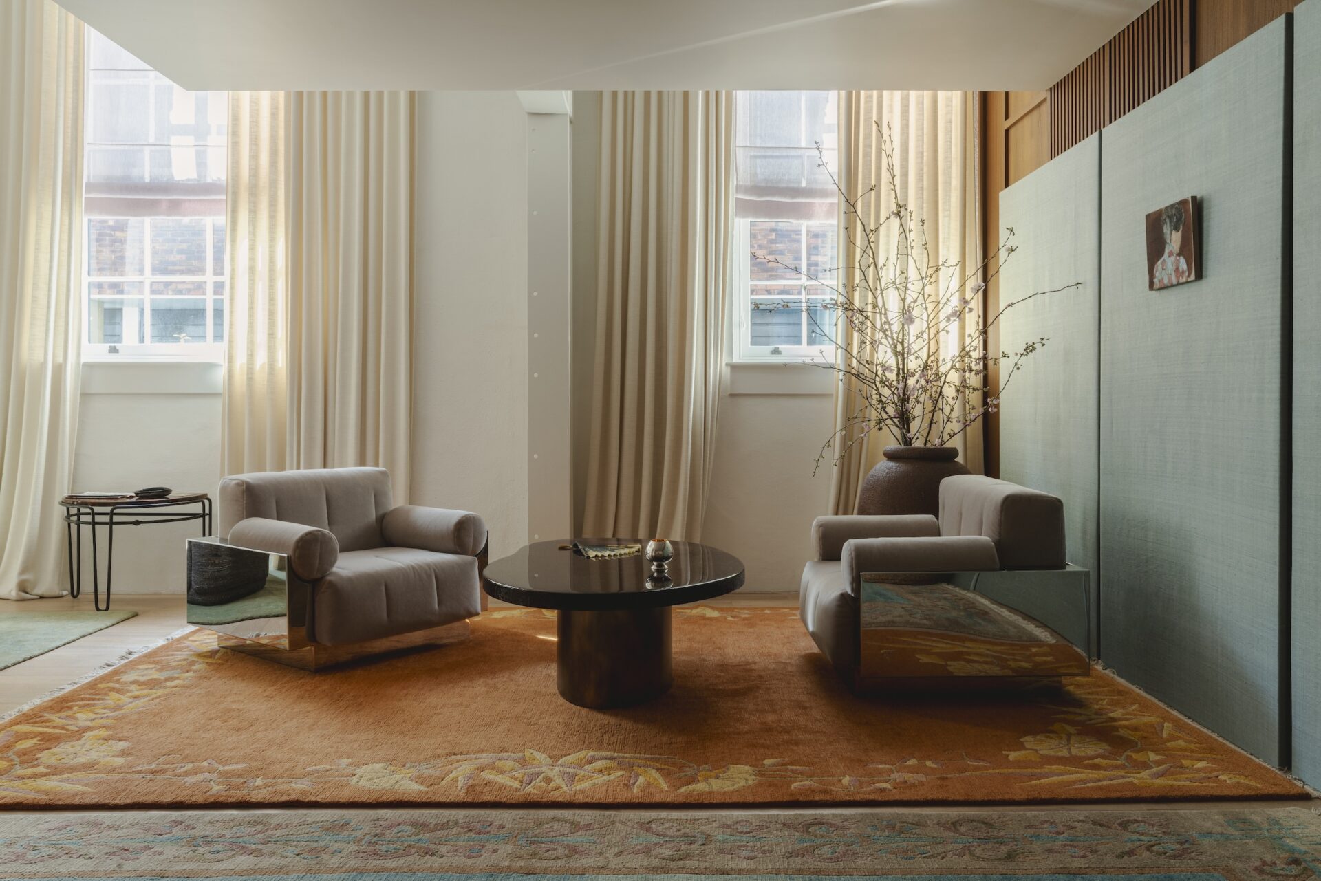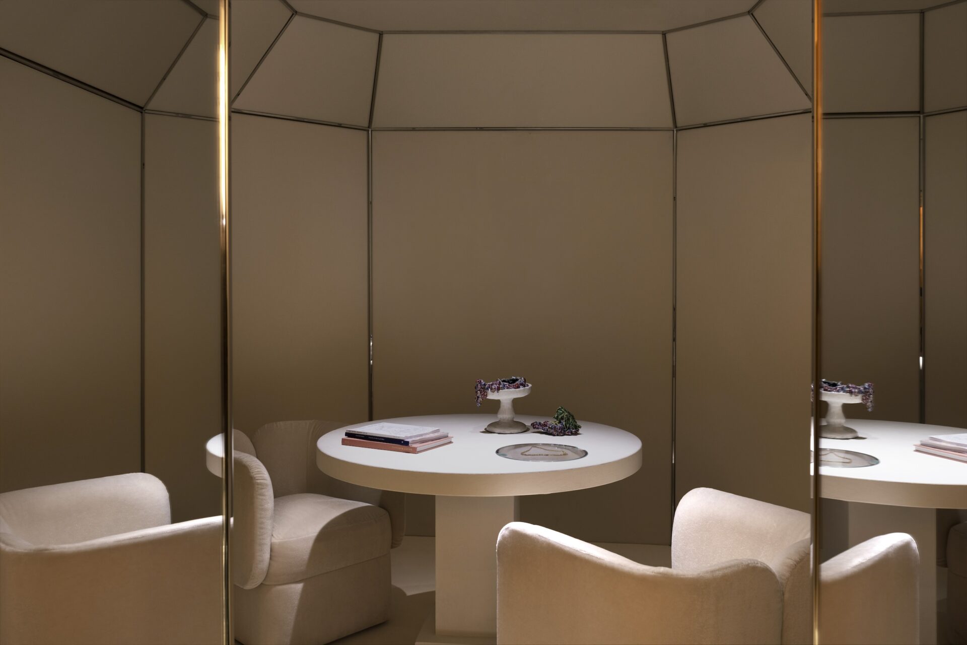 Sandra Benhamou: We transformed the space, curating a selection of my own collection alongside a mix of vintage pieces, and designs from The Invisible Collection catalogue. We placed the Pierre lamp and Edo vase on a console by Axel Einar Hjorth (from Modernity), the Marcello backgammon table on a Diurne rug, the Dolly armchair in front of a screen by Pierre Bonnefille (from Marion Stora), Jean-Michel Frank chairs around the Kaki table, and Puiforcat x Donald Judd pieces on the Leon bar.