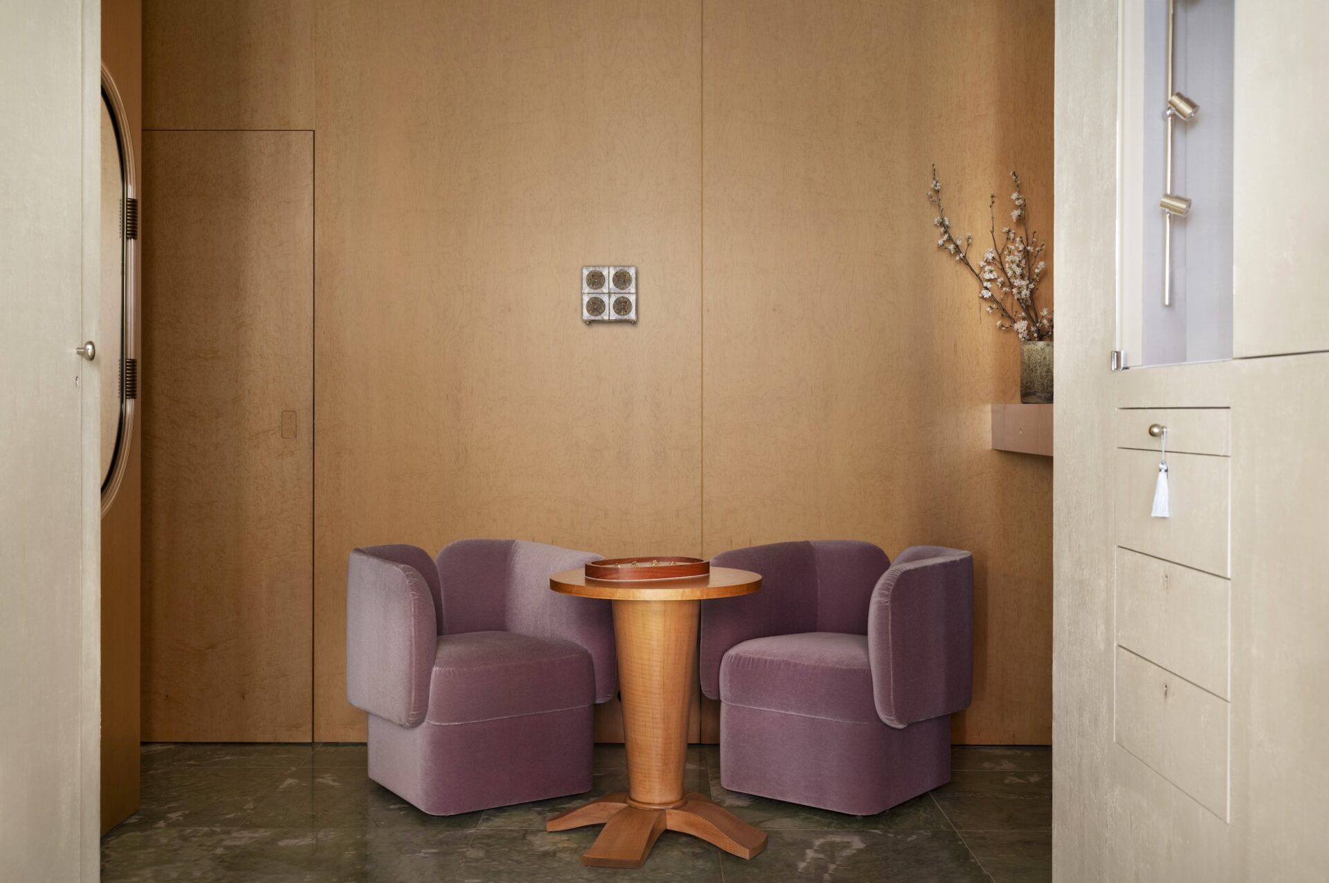 SB: There’s an intentional sense of luxury in this project. The brand’s founders Jessica Warch and Sidney Neuhaus wanted a space that was both welcoming and exclusive, refined yet accessible, simple yet sophisticated. The overall design, composed of velvet, satin, plaster, and speckled wood, where soft blue and white tones dominate, creating an enveloping softness.